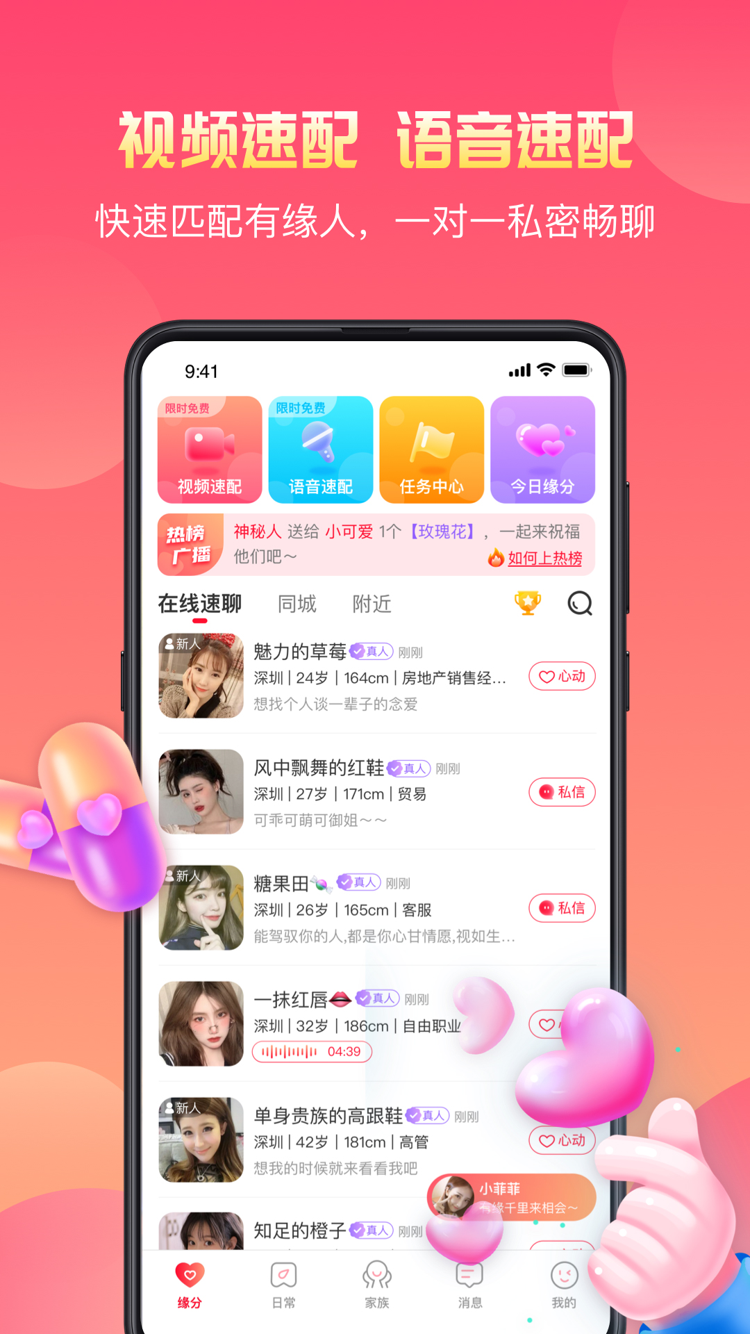 视频速配语音速配:通过视频或语音快速匹配有缘人,享受一对一的私密畅聊体验。