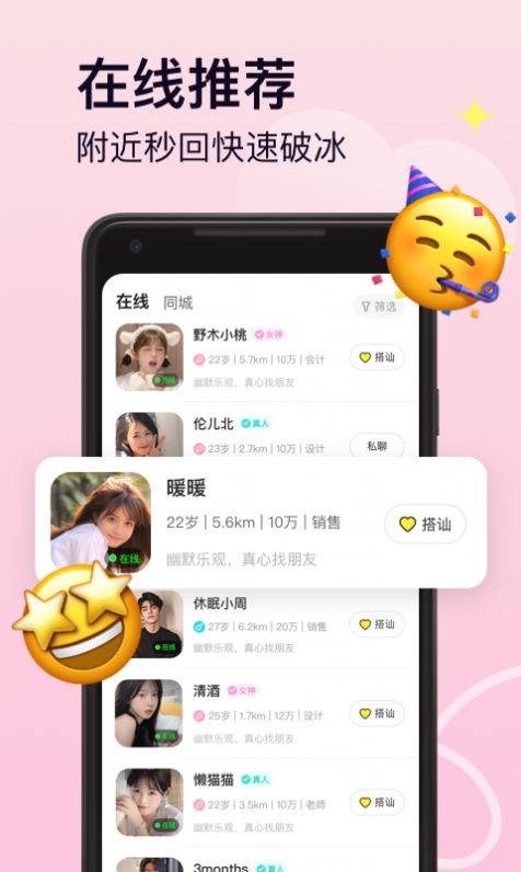 用户能够在这里发表自己的心情动态,吸引更多有趣的人一起互动,扩展你的社交圈,平台还支持动态点赞评论功能,促进用户间深度交流。平台不仅支持在线对话,还可以一键开启语音互动,还能面对面等更多方式,高清视频通话功能让远距离交友也能感受到真实温度。用户能够在这里看到同城优质的对象,线上跟你一起建立情感连接,拉近你们的距离,基于LBS的智能推荐让同城交友更加便捷高效。