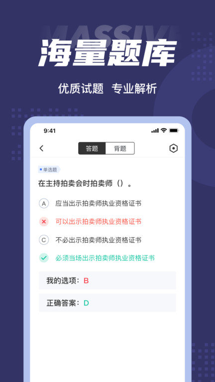 拍卖师考试聚题库手机版是一款专为备考拍卖师资格证考生设计的智能学习平台。软件整合了海量历年真题、权威解析和模拟测试功能,通过科学的学习体系帮助用户系统掌握拍卖行业知识要点。平台采用智能算法分析用户学习轨迹,精准推送薄弱环节练习题,搭配视频课程和考点精讲,让用户随时随地高效备考。无论是零基础学员还是需要查漏补缺的考生,都能在这里获得个性化的学习方案,大幅提升考试通过率。