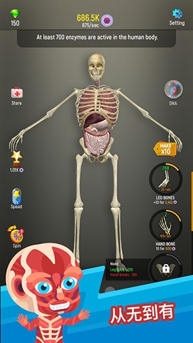 进入游戏后,玩家首先获得基础细胞资源。通过合理的培养和进化,这些细胞将逐渐分化成各种人体组织。游戏初期主要集中发展骨骼系统,这是整个人体的支撑框架。随着游戏进展,玩家可以解锁更多资源,加速进化过程。