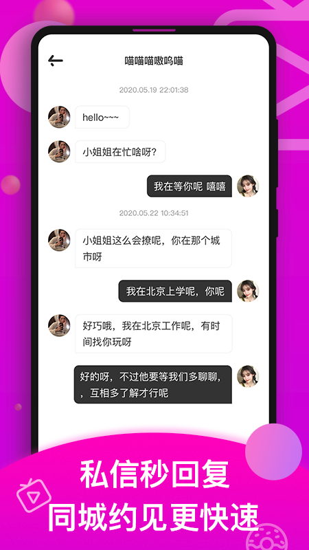 我们深知每个人都有自己的社交偏好,因此飞飞app提供了多样化的社交选择。无论是喜欢文艺气息的番茄型,还是热情奔放的香蕉型,都能在这里找到适合自己的社交方式。独特的"一对一"社交模式让您能够深入了解每一个有趣的灵魂,探索神秘的社交新世界!在这里,附近的女生可能会主动与您搭讪,同城的男生也会热情地向您示好,让您体验前所未有的社交乐趣。