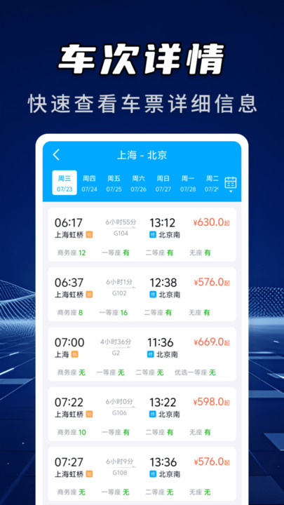 用户只需输入出发地、目的地和出行日期,系统即可智能筛选所有符合条件的列车班次,包括跨城联程等复杂路线。查询结果将直观展示每趟列车的发车/到达时间、运行时长、余票状态及票价梯度,并支持按商务座/二等座等多维度筛选。特别设计的余票监控功能会通过弹窗+短信双通道提醒,确保用户不错过任何购票时机。