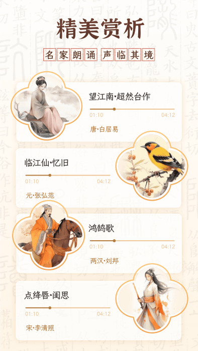 名家朗诵身临其境,每首诗词都配有专业播音员的深情朗诵