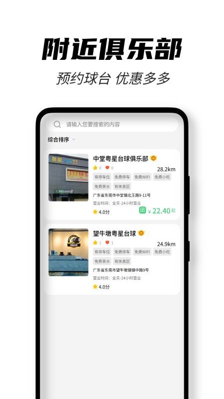这是一款专门为台球爱好者提供综合服务的软件,用户可以在这里轻松快速的查找附近的台球俱乐部,用户可以对附近的台球俱乐部比价筛选,查找更实惠的俱乐部预约球台打球,还方便用户在这里查找附近的台球教练,预约专业的台球教练学习打台球,可帮助用户自身打台球的球技水平。平台持续优化用户体验,定期更新功能模块,已成为国内最受欢迎的台球垂直领域应用之一。
