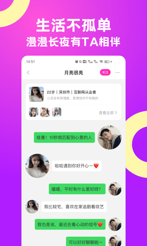 【速配闪约】一键拨打,根据您的爱好速象,有缘人就在下一秒遇见,给彼此一次深夜灵魂交友,处cp谈恋爱的机会。快速匹配功能让您不错过任何可能的缘分。