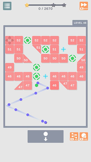 用手指按住屏幕并移动瞄准,感受精准控制的乐趣。找到最佳位置和角度以击中所有砖块,考验你的判断力和反应速度。当砖块的耐久度达到0时,被摧毁,同时会触发华丽的爆炸效果。永远不要让砖块到达底部,否则游戏就结束了,这需要你时刻保持专注。