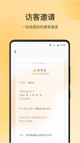访客邀请:生成专属电子邀请码,访客扫码即可进入小区,全程无需人工登记。