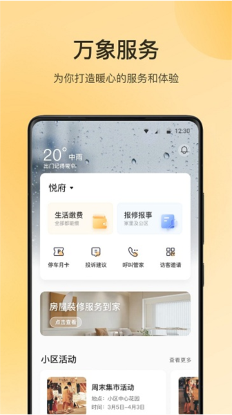 物业服务:在线提交报修申请,实时跟踪处理进度,还能对服务进行评价打分。