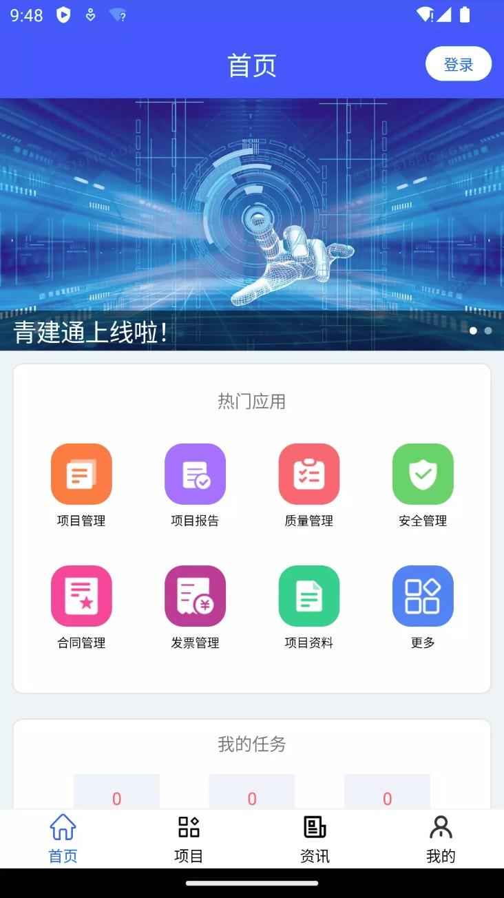 在首页点击热门应用中的相应功能模块,可进入项目管理、质量管理等页面进行操作,常用功能可自定义置顶。