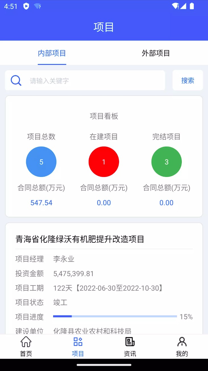 底部导航切换到"项目",可选择内部项目或外部项目,并通过搜索栏输入关键词查找,支持高级筛选和组合查询。