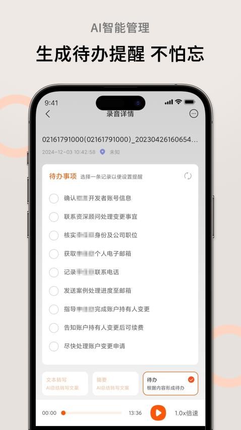 智能分析会议内容,自动提取关键事项并生成待办提醒,支持自定义提醒时间和方式,确保重要任务按时完成,让工作更有条理。