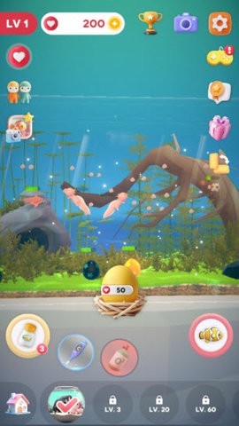 培养鱼类并升级,通过精心养殖将鱼类提升到100%的培育程度,随着经验的逐步积累,你还能够为鱼类升级,开放更多新颖的鱼缸样式。每完成一个培育周期,玩家都能获得稀有基因碎片,用于解锁传说中的神秘鱼种,如会发光的深海灯笼鱼或拥有彩虹鳞片的梦幻天使鱼。
