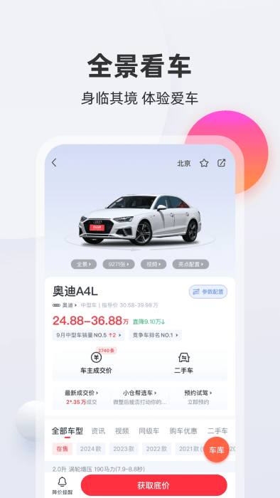 最新版本的买车宝典引入了多项创新功能:360度全景看车技术让您足不出户就能全方位了解车辆细节;实时经销商报价系统支持在线询价和砍价;智能识车功能只需拍照就能识别车辆信息;优化后的车型对比工具使配置差异更加直观。此外,平台还提供贴心的情景选车服务,根据您的实际用车需求推荐最适合的车型,并与认证商家合作,确保购车过程安全可靠。全新的汽车头条板块汇集最新行业资讯和报价信息,让您随时掌握汽车市场脉搏。