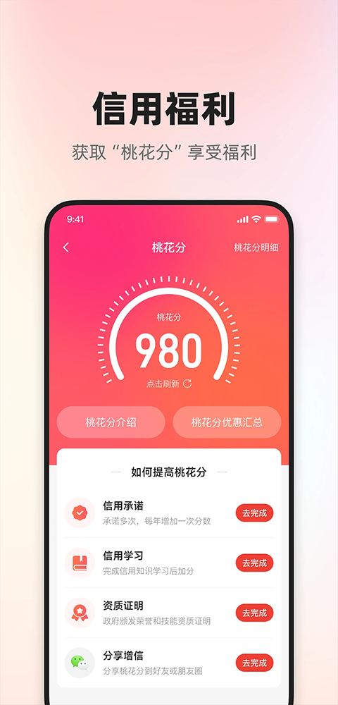 新增了桃花分任务系统,为用户提供更多积累信用积分的机会。