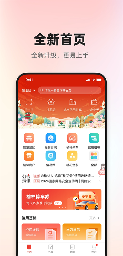 信用榆林APP是一款由榆林市政府主导开发的智慧城市生活服务平台,以创新的"桃花分"信用体系为核心,深度整合本地优质资源,为市民提供全方位、便捷化的生活服务体验。这款应用不仅实现了信用价值的数字化转换,更通过多元化的应用场景让市民切身感受到"信用有价"的城市理念,推动榆林市向智慧信用城市迈进。