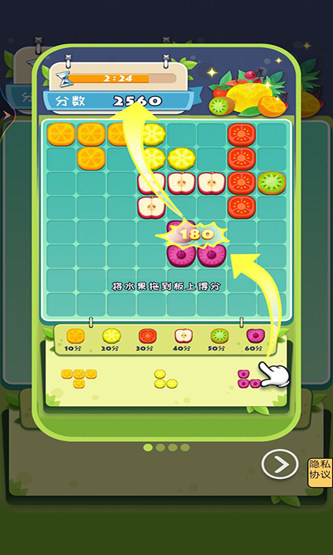 这款游戏的核心玩法是经典的淘汰赛机制,但加入了大量创新元素。游戏中设计了多元化的关卡模式,从限时挑战到分数比拼,各种玩法等你来破解。Q版的水果设计不仅可爱迷人,每个水果都有独特的表情和动作。酷炫的淘汰特效让每一次消除都充满视觉冲击力,合理的连击淘汰可以获得更高的分数加成。游戏中有各种特殊关卡等待挑战,比如会发芽的魔法果实关卡,能带给你震撼的视觉盛宴。优美的游戏画面配合轻松愉悦的背景音乐,让玩家在游戏过程中获得双重享受。超过200个精心设计的关卡,搭配可爱迷人的画风,保证让你爱不释手!