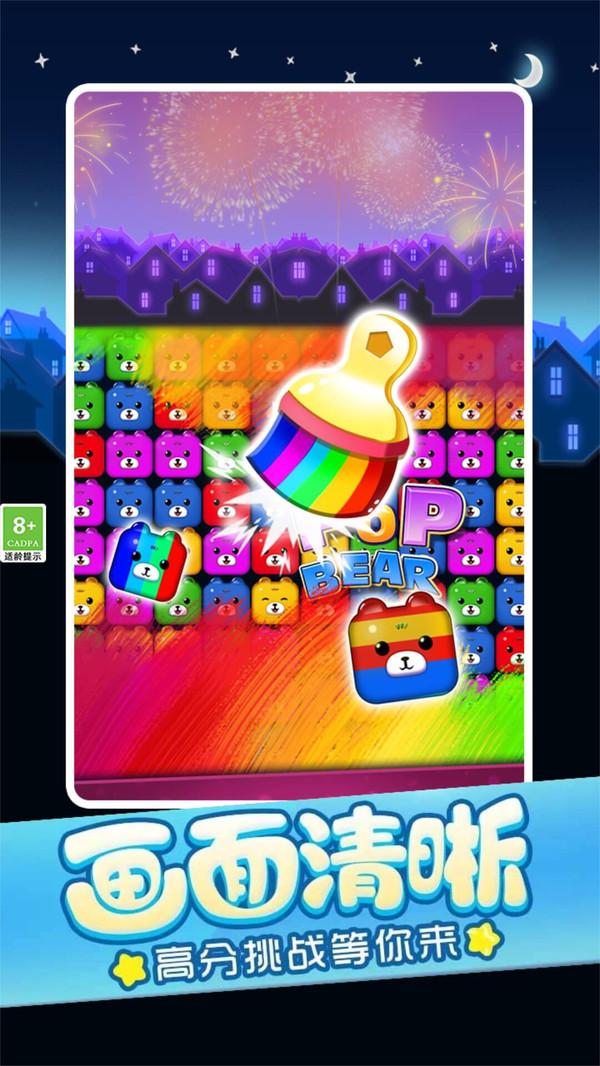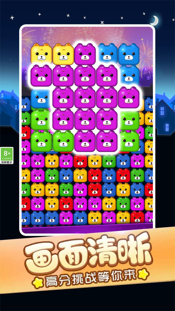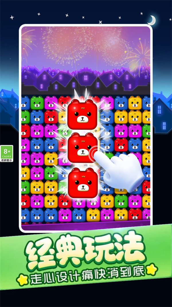 可爱方块设定:游戏中的每个方块都被精心设计成不同造型的萌熊形象,有的戴着眼镜,有的抱着蜂蜜罐,细节丰富充满童趣。这些可爱的方块不仅赏心悦目,消除时还会发出欢快的音效,大大提升了游戏的趣味性。