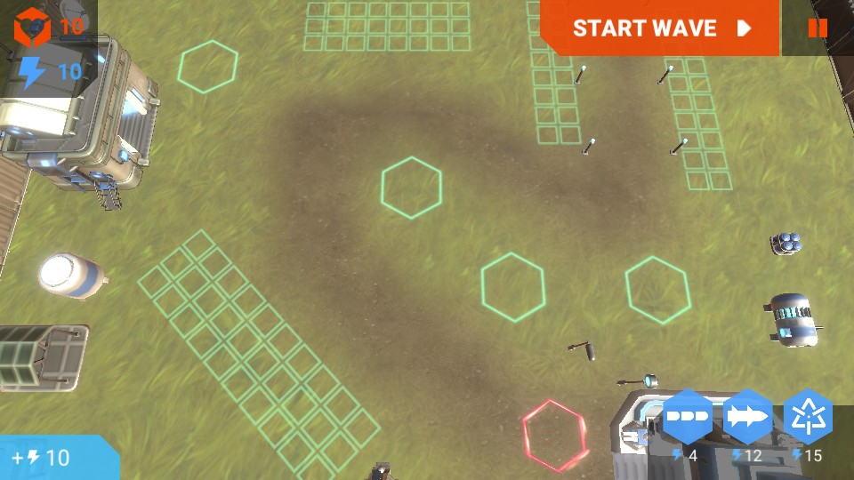 游戏开始时,玩家将置身于一个六边形网格地图中,需要合理利用初始能量资源部署防御设施。系统提供了多种类型的防御塔供选择,每种塔都有独特的攻击方式和升级路径。布置好防御阵型后,点击STARTWAVE按钮即可开启敌人进攻波次。在战斗过程中,玩家需要密切关注战场态势,通过右下角的战术指令面板实时调整防御策略,比如指定集火目标或重新部署防御塔位置。成功抵御10波敌人进攻后即可通关,系统会根据表现给出星级评价,玩家可以选择进入下一关卡挑战更复杂的战场布局和更强大的敌人。