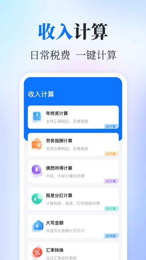 退税查询Refund个税通APP是一款由成都巴初科技有限公司精心打造的智能税务服务软件,致力于为用户提供全方位、便捷高效的税务管理解决方案。作为一款功能强大的税务工具,它不仅涵盖了基础的个税计算功能,还整合了收入核算、汇率转换、房贷测算等实用模块,真正实现了"一站式"财税服务体验。