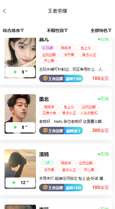 即时语音开黑,轻松躺赢上分,打游戏不再孤单;平台拥有海量优质大神陪玩师,24小时在线为你服务。非常受欢迎的陪玩服务平台,在这里你能找到心仪的小哥哥或小姐姐,享受专业陪玩服务。高颜值陪玩师不仅游戏技术过硬,还多才多艺,能为你带来更多欢乐时光。