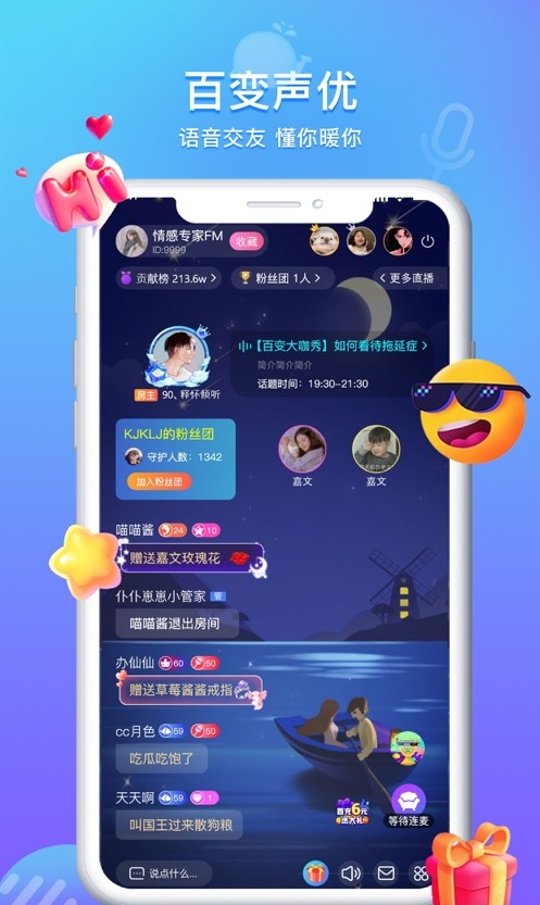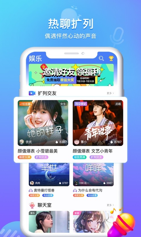这里的各种互动交友方式丰富,帮助各地的用户们在线上也可以随时加入各种聊天室;平台提供主题语音派对、兴趣小组等多种社交场景,满足不同社交需求。是非常靠谱的语音交友平台,大家在无聊的时候都可以在平台里面来交友互动;严格的身份认证机制确保每位用户的真实性,让社交更安心。每天都有各种各样的互动交友模式,还能根据用户们的需求来为你匹配。智能算法会学习您的社交偏好,推荐最合适的聊天对象。