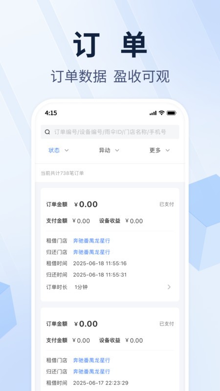 蜻蜓借伞app最新版是一款专为共享雨伞商户打造的智能管理平台,能够帮助运营者高效管理伞具设备、监控业务数据并优化用户体验。该应用特别适合各类商户使用,通过直观的数据看板可以随时掌握各投放点的设备数量、订单总量、交易金额及租金收入等核心运营指标,让管理者对业务状况一目了然。无论是查看实时运营状态,还是监控每个门店的可借伞具和可还数量,都能通过简洁明了的界面轻松完成。