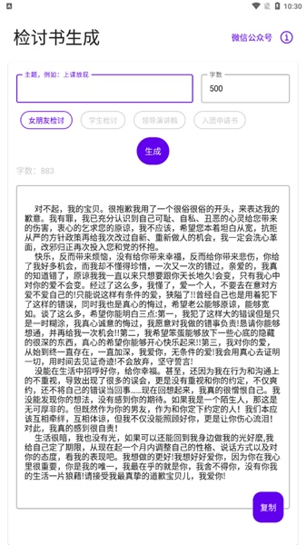 写锤子检讨书是一款专为需要撰写检讨书的用户设计的智能生成工具。无论是学生、职场人士还是日常生活中需要表达歉意的人,这款应用都能提供高效便捷的解决方案。通过简单的操作,用户可以选择不同的检讨主题,如学生违纪、情侣矛盾或工作失误等,并自定义字数要求,系统会快速生成一份结构完整、语言得体的检讨书。告别传统写作的烦恼,让检讨书撰写变得轻松高效,同时还能根据个人需求调整内容,确保每一份检讨书都独一无二。