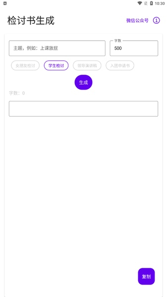 首先下载并安装写锤子检讨书软件,打开后选择适合的检讨主题,例如学生检讨或情侣道歉。进入生成页面后,输入具体事件描述,如上课开小差或对女友发脾气,并设置字数要求,点击生成即可获得一份完整的检讨书。用户还可以选择领导发言稿等模板,生成后直接复制使用,方便快捷。