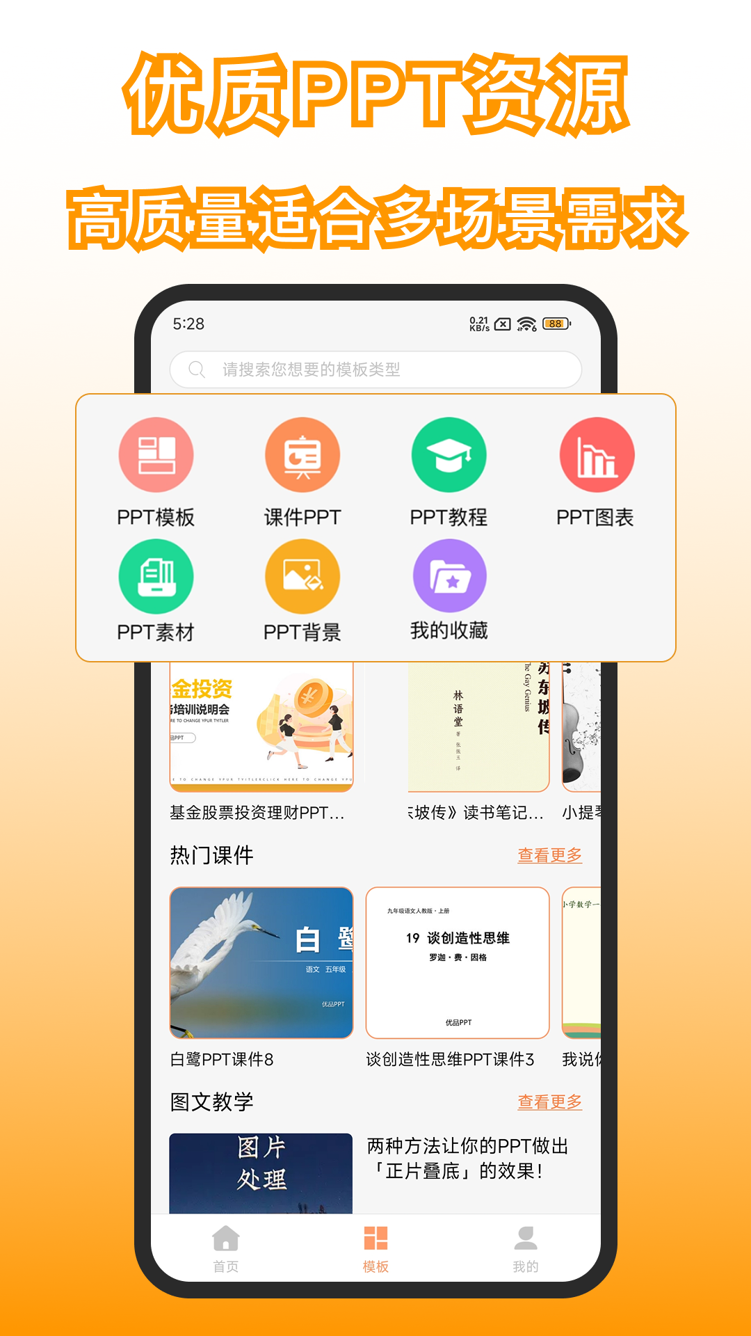 【PPT模板资源】软件内置海量优质PPT模板,堪称手机端的PPT模板大全。模板分类细致全面,涵盖产品策划、企业宣传、招聘简历、佳节庆典、教育培训教学课件、年终总结、毕业答辩等多个实用场景。此外,还提供大量精美的主题壁纸、主题图标和素材库,帮助用户快速创建专业演示文稿,轻松完成PPT制作。