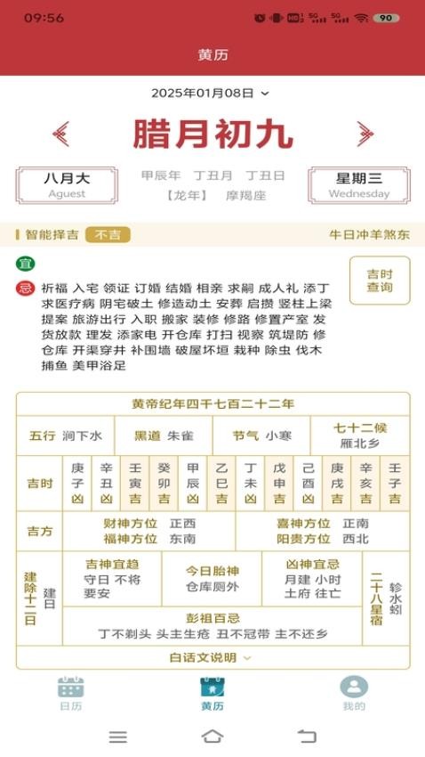黄历页面采用卡片式设计,直观展示当日宜忌、冲煞、吉神方位等信息。用户可以通过滑动查看前后几天的黄历内容,方便提前规划重要活动。
