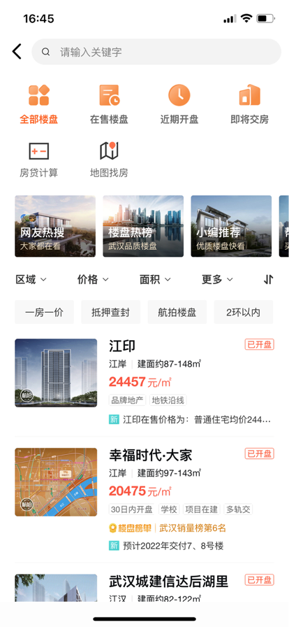 强大的查房价找楼盘功能,提供武汉在售、待售楼盘大全,包含详细户型图、价格区间、配套设施等关键信息