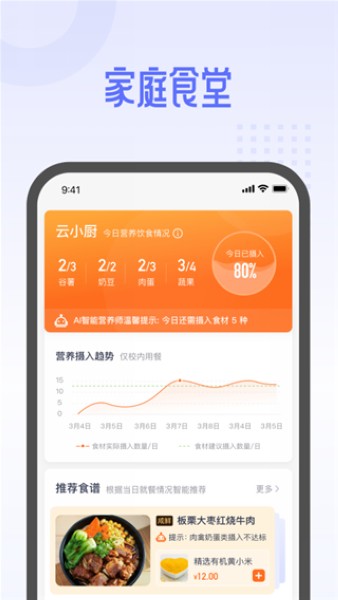精准营养,各路专家+人工智能,为每个孩子提供营养服务。系统会根据学生年龄、体质等数据,智能推荐最适合的营养搭配方案。