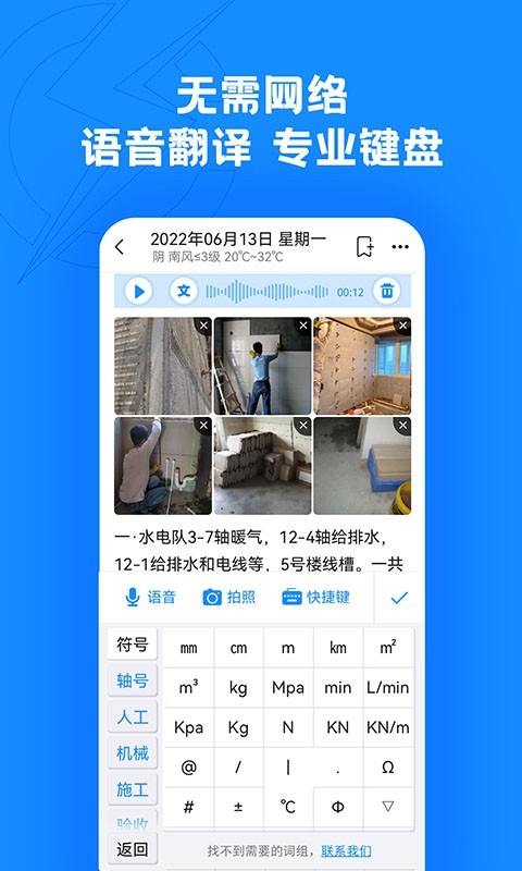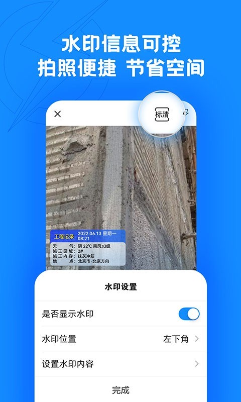软件的主要特色功能包括:日常记录便捷记功能,提供"语音+拍照+文字"多样化的记录方式,让现场工作随时处理、备忘记录随时完成;工作表单秒生成功能,可以从备忘记录自动生成日志等表单,随时随地编制,大幅减少重复劳动;照片水印自定义功能,除了水印相机功能外,还能给其他照片添加水印,并自由调整水印内容;工作生活可分隔功能,为工作照片提供独立存储空间,实现工作生活照片分离,不干扰日常生活,同时提供多档位照片质量选择,有效节省手机存储空间;表单快速设计功能,支持将EXCEL表导入系统生成表单,自动适配手机屏幕,满足企业/项目部的个性化表单设计需求;表单自动合并功能,可以将多张指定表单合并为一张,快速汇总统计项目工作,便于领导查阅施工日志等资料内容;不受网络限制功能,在无网无信号的情况下仍可正常使用,有网络时自动保存云端,确保数据安全不丢失。