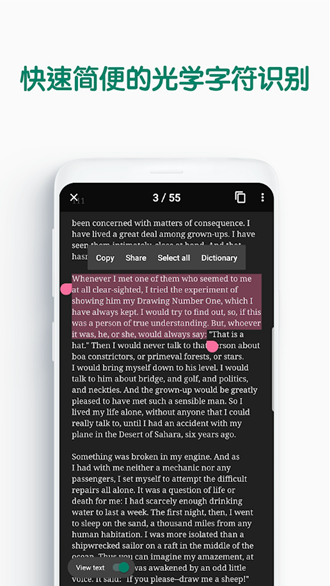 vFlat采用深度学习算法优化扫描效果,确保文字识别准确率极高,即使是轻微弯曲的页面也能清晰呈现。此外,它还支持多页连续扫描和自动页码排序,帮助您高效整理电子文档。通过强大的OCR(光学字符识别)技术,vFlat可识别18种语言的文字,满足不同用户的需求。无论是学习资料、工作文件,还是家庭相册,vFlat都能完美胜任,让您的手机成为随身携带的电子图书馆。