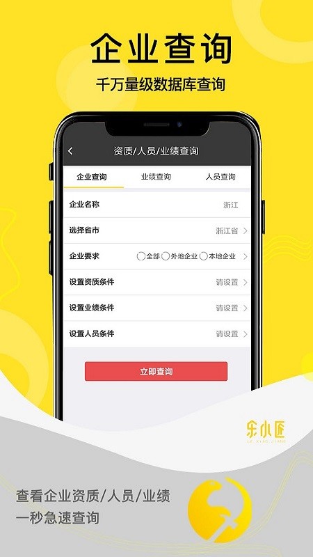 乐小匠app提供人员、企业、业绩三大核心查询模块,用户可根据需求自由切换使用。平台支持按省份、要求、条件等多维度快速搜索,帮助用户精准定位目标信息。实时更新的项目数据库确保用户总能获取最新资讯,不再担心找不到合适资源。所有招标数据信息均免费公开,用户可随时查询使用。专业的移动法律服务为用户竞标过程保驾护航,全方位保障用户权益。乐小匠app将持续优化服务,为建筑行业提供更专业、更高效的招聘求职解决方案。