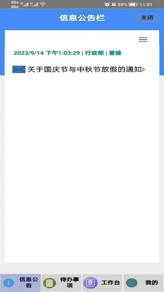 登录后点击底部"信息公告",可查看公司发布的各类公告通知,及时获取重要信息,支持按部门筛选查看。