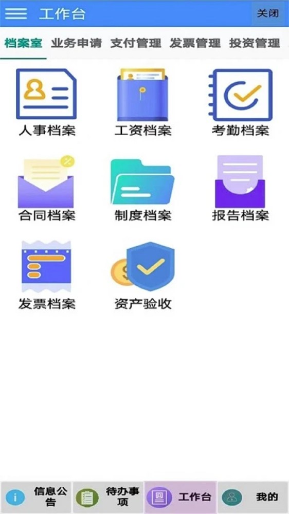 进入"工作台"模块,可访问人事、工资、考勤、合同、制度等档案及资产管理工具,提供智能搜索功能。