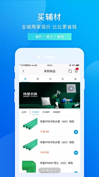 辅材采购:支持快速添加商品到购物车,一键发布采购需求,简化采购流程,节省用户时间和精力。