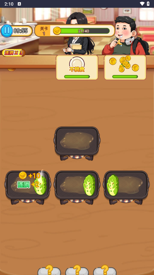 操作简单易上手:消除规则简单明了,只需将盘中三串相同烤串聚集即可消除,无论是新手还是资深玩家都能快速掌握,轻松投入游戏,适合在休闲时间放松身心。游戏界面设计直观友好,所有功能按键都经过精心布局,确保操作流畅自然。