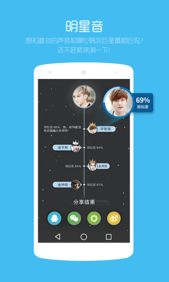 韩语魔方秀app汇聚了最新最潮的韩剧、K-pop音乐和热门综艺节目资源,让你在学习的同时紧跟韩流时尚。独创的多角色配音功能让你可以邀请好友一起为喜欢的影视片段配音,甚至有机会与偶像"同台飙戏"。应用还特别设计了即时字幕取词功能,遇到不懂的单词随时查询,搭配专业的韩语发音表,让你的发音更加标准纯正。
