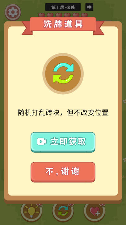 游戏提供了多种实用道具来帮助玩家顺利通关。提示道具可以为你指出当前可以消除的物品组合,非常适合在卡关时使用。刷新道具能够随机重置所有砖块的位置,为你创造新的消除机会。生命道具可以为你提供额外的4点生命值,让你有更多尝试的机会。这些道具设计合理,既不会破坏游戏的平衡性,又能为玩家提供恰到好处的帮助。