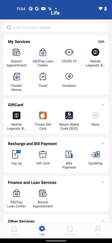多样化的功能:除了基础的支付转账功能外,KBZPay还创新性地推出了个人信贷、数字保险、慈善捐赠等增值服务。用户可享受"先消费后付款"的分期服务,购买热门娱乐平台的礼品卡,还能一站式缴纳各类生活账单。
