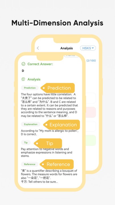 【HSK真题】所有真题均获得官方授权,提供逐词详细解释和例句分析;每道听力题都支持逐句精听,从多个维度解析考点和答题技巧。