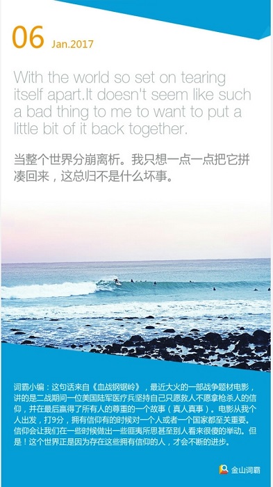 每日英文:每天精选一句英文美文,让你在点滴积累中提升英语素养。这些精选语句不仅语言优美,更蕴含人生哲理,让你在学习语言的同时感受文字的魅力。