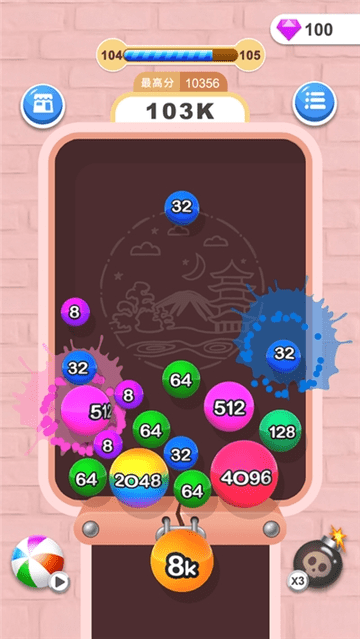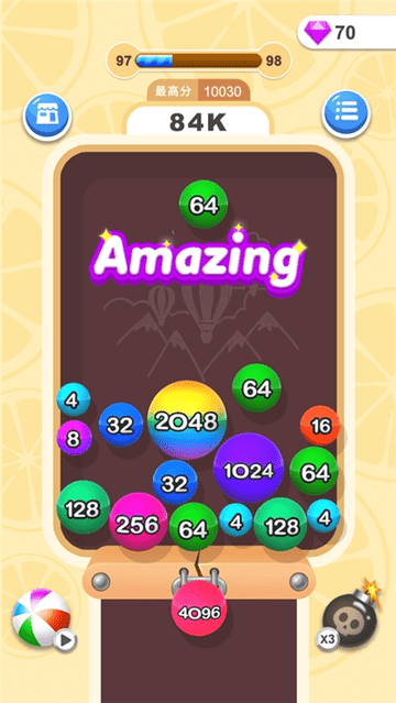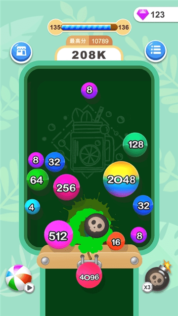 努力通过数字相加的规则来让球球合并到一起吧,只要可以让空间留下足够的空当地区你的解谜就还有希望;游戏还加入了时间挑战模式,考验玩家在限定时间内的反应速度。