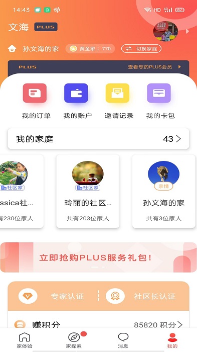 【我的家人】模块整合家庭成员管理功能,支持多人实名认证,家庭相册云端存储,订单信息一目了然,邀请新成员还能获得专属福利。