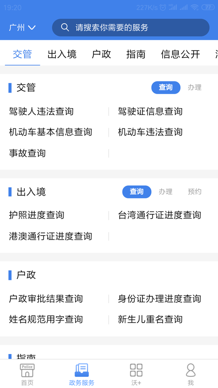 软件设有完善的个人中心,包含我的信息、业务办理、消息通知、收藏夹等实用功能模块。在出入境服务方面,支持护照、港澳通行证、台湾通行证等证件的签注结果查询和预受理服务。户籍业务板块提供居民身份证办理和户籍审批结果查询功能。监管服务支持预约律师会见和家属会见。交通管理模块可查询驾驶证、机动车违法等信息。此外,还能通过软件获取广东省公安厅官方微信、微博发布的最新警务资讯和城市动态。