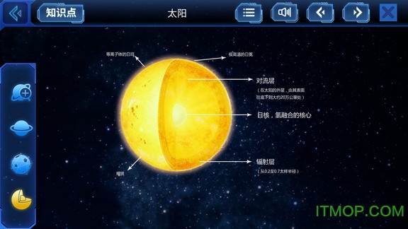 对太阳系及地月系所有星球进行全面科普,星球可360旋转和缩放,并有星球的详细说明、星体特性和剖面图;用户可以通过交互式探索了解每个行星的独特特征,包括大气组成、地质构造等详细信息。