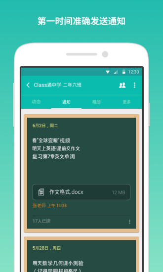 发送班级通知:教师可精准发送各类通知公告,系统智能显示未读成员名单,支持一键重发功能,确保重要信息100%传达。告别传统纸质通知的遗漏问题,让班级管理更加高效便捷。