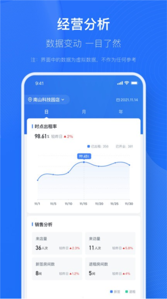 【经营分析】:通过大数据分析技术,小泊资管可以生成多维度的经营分析报告,包括入住率趋势、收益变化等核心指标,并支持自定义时间段的对比分析;